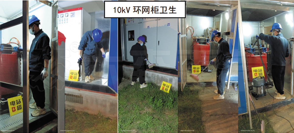 首先開展的是2面10kV環(huán)網(wǎng)柜的清掃、除霉工作,整個(gè)工作由我們?nèi)斯餐瓿?,我?fù)責(zé)擦拭工作;周工(周志強(qiáng))負(fù)責(zé)打掃地面衛(wèi)生;沈工(沈凡)負(fù)責(zé)清灰、除霉工作,由于變壓器積灰較多,灰塵很厚,還有雜草纏繞在柜門上,清理難度較大,整個(gè)過程消耗了1個(gè)多小時(shí),最終于4月3號(hào)21:30左右完成清掃工作。