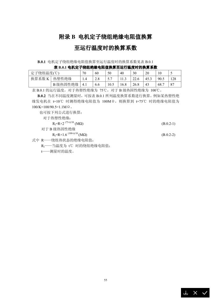 附錄B 電機(jī)定子繞組絕緣電阻值換算至運(yùn)行溫度時(shí)的換算系數(shù)定子繞組溫度(℃) 70 60 50 40 30 20 10 5 換算系數(shù)(K) 熱塑性絕緣 1.4 2.8 5.7 11.3 22.6 45.3 90.5 128 B級熱固性絕緣 4.1 6.6 10.5 16.8 26.8 43 68.7 87